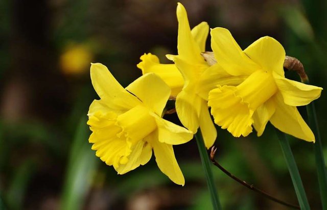 Daffodils grow perennially from bulbs. In temperate climates they flower among the earliest blooms in spring. Daffodils often grow in large clusters, covering lawns and even entire hillsides with yellow.