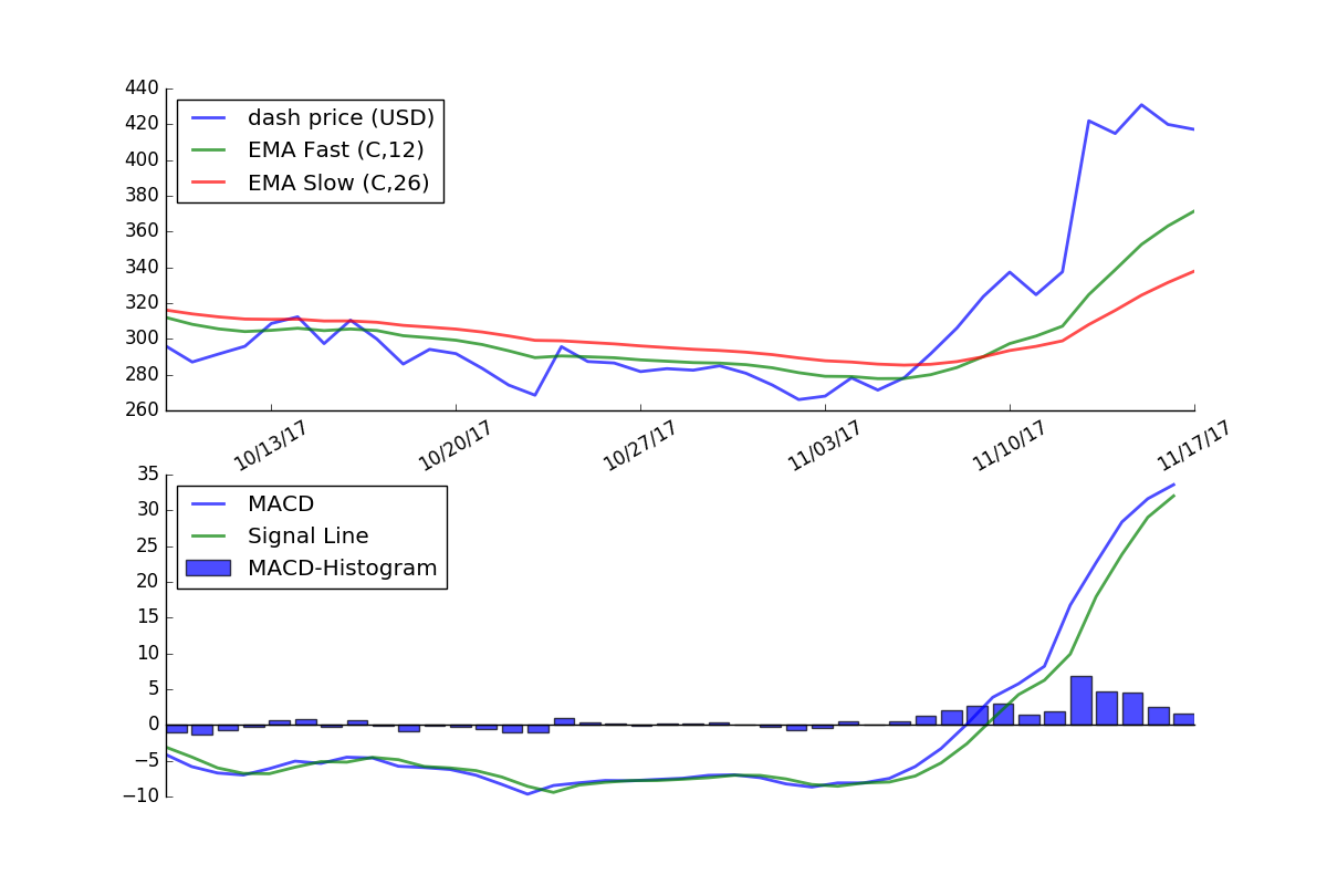 The graph below shows the MACD applied to the price of Dash using daily price data for the last 40 days.