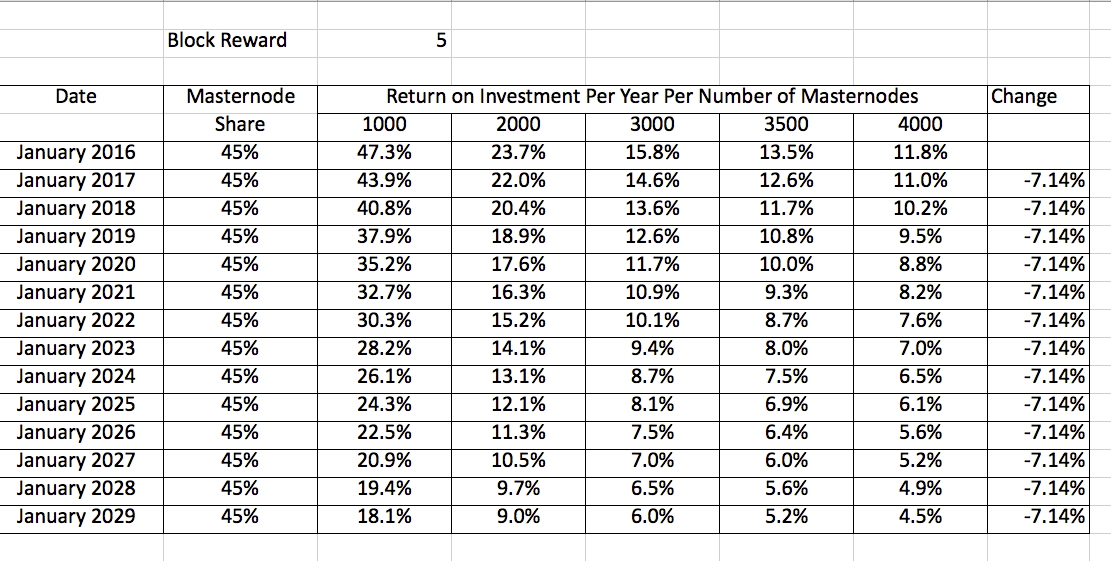 In return for providing this services, one masternode is selected by the network to receive a part of the reward of each mined block. The split of the reward evolves following this table: