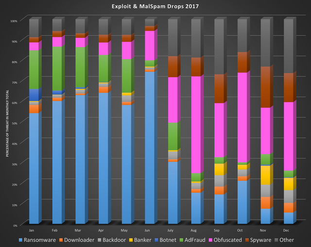 However, since that point, the percentage of ransomware drops has fallen significantly, dropping to under 10 percent of malicious payloads in December.
