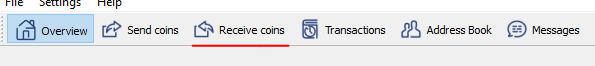 To receive coins the sender needs an address from you where he can send it to. To get your receiver address click on the button “receiving coins”: