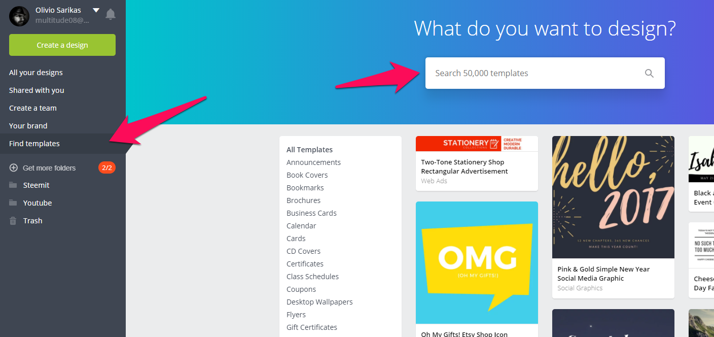 Canva has a huge Marketplace with over 50.000 Design. You can even search and quickly find designs you like. The designs come in a wide variety of format, like brochures, business cards, coupons, web banners and may more.