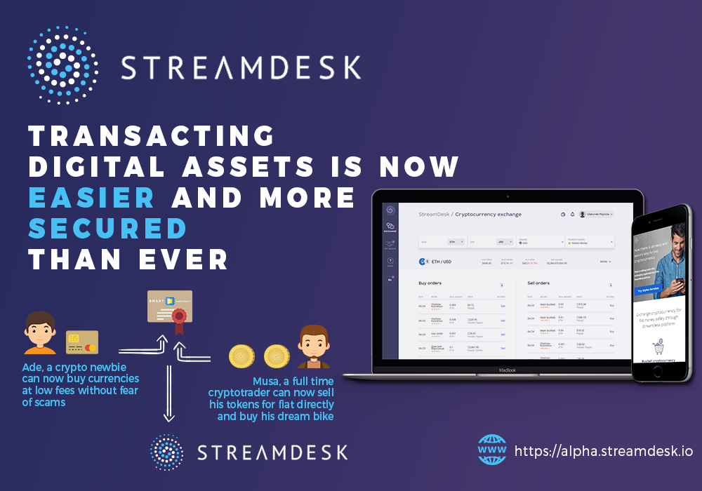 The STREAMDESK promotional design below shows the use case of the platform. At the top is the logo and below is a promotional quote which states "Transacting digital assets is now easier and more secured than ever", in front is STREAMDESK on laptop and mobile devices.