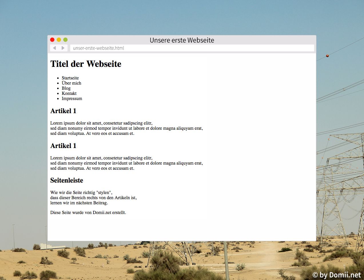 Der Browser liest die HTML-Datei wie wir Menschen von oben nach unten, deswegen ist unsere Seitenleiste noch unter und nicht neben dem Inhalt zu sehen. Damit dieser Bereich neben unseren Inhalt steht benötigen wir noch eine style-Datei.
