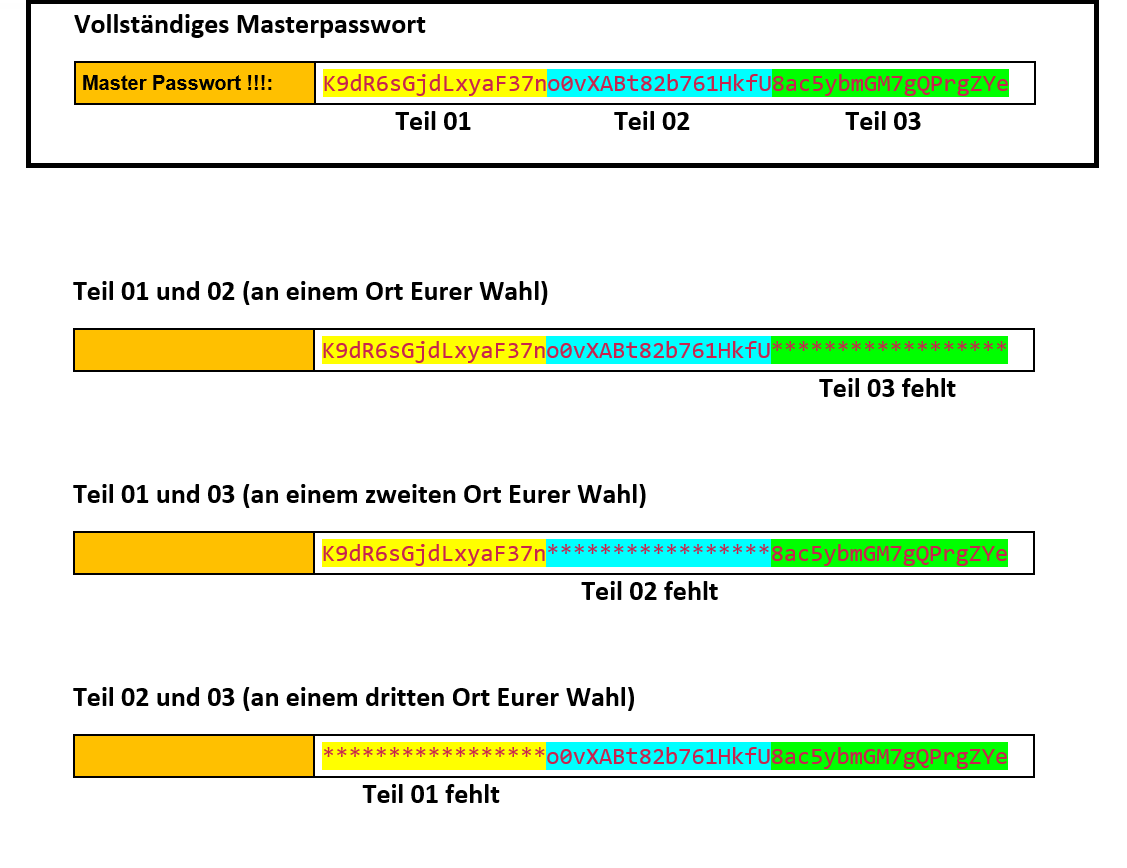 Im Anschluss werden die drei Blätter an drei unterschiedliche Orte Eures Vertrauens gebracht und dort sicher verwahrt. Da jeder Teil zweimal vorhanden ist, ergibt sich daraus der Vorteil, dass selbst wenn ein Blatt nach einer gewissen Zeit, aus welchen Gründen auch immer, nicht mehr auffindbar oder zerstört worden ist, (die hauseigene Schildkröte hat zugeschlagen und ein Blatt gefressen) aus den anderen beiden Blättern immer noch das vollständige Masterpasswort zusammengesetzt werden kann.