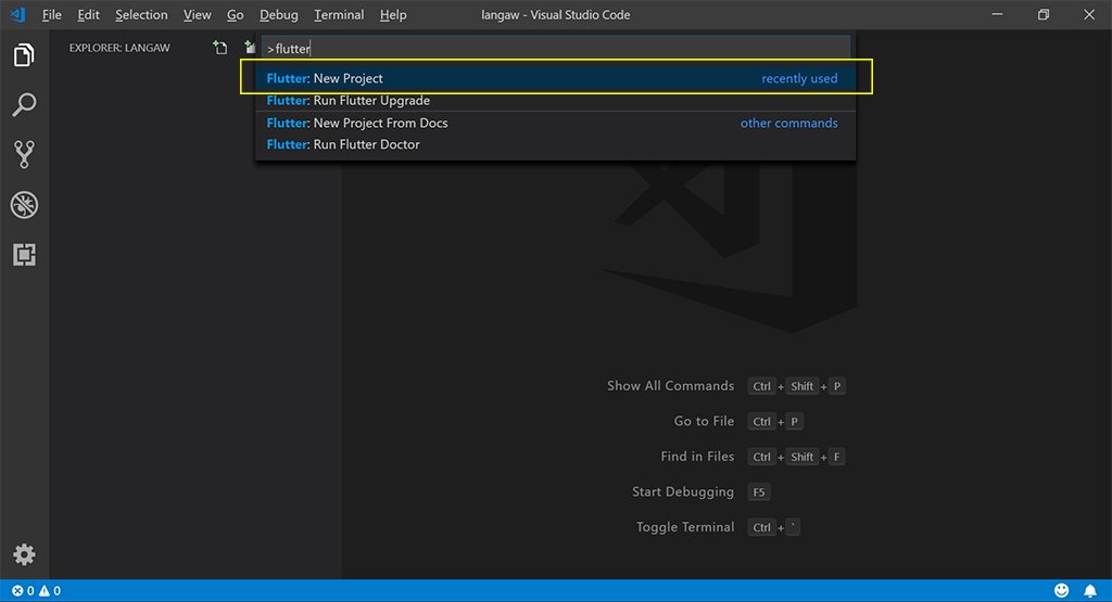 The Flutter plugin for VS Code has a command for creating Flutter apps. Just press Ctrl + Shift + P on any VS Code screen and type “flutter”. From the drop-down menu you can click on Flutter: New Project, type in the name of the project (we’ll use langaw for the tutorial, but you can use any), and choose the location you want to put your project in.
