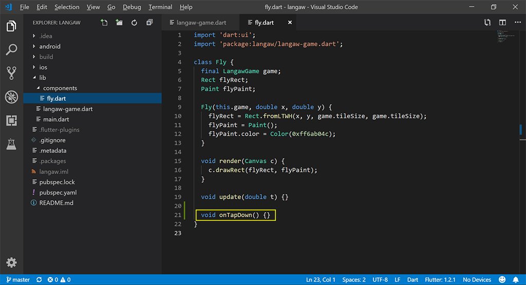 We’ll be doing a lot of jumping around so let’s open up ./lib/components/fly.dart while we’re at it. In here, we’ll add an event handler that will only be triggered if this Fly instance is tapped.