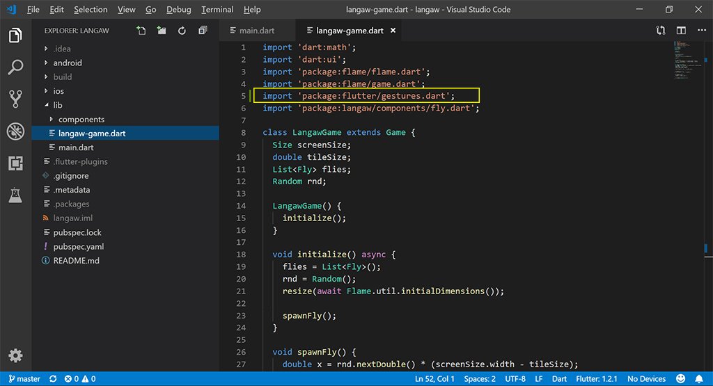 Now let’s link the game class to the main function so when the game is run it actually starts an instance of our LangawGame class. Let’s go back to ./lib/main.dart and import our newly created class file.