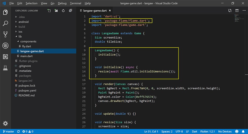 Let’s go back and edit our game class (./lib/langaw-game.dart). Let’s prepare it for drawing (and later movement of objects) by determining the dimensions of the screen.