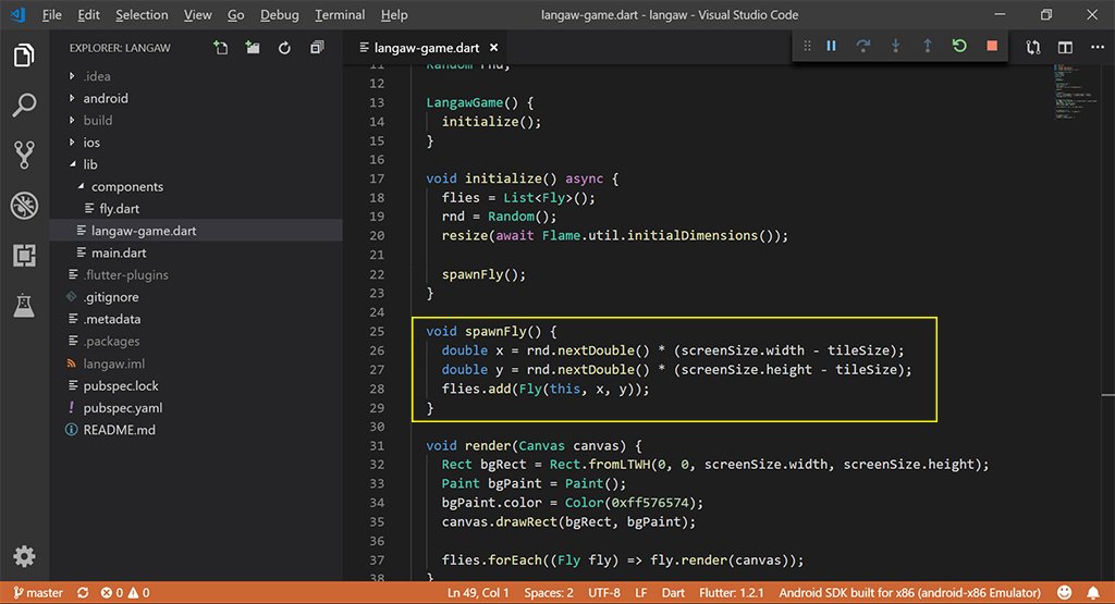 Then, let’s create an instance of our game class and call the runApp function. The runApp function requires a Widget so we pass our LangawGame instance’s widget property.
