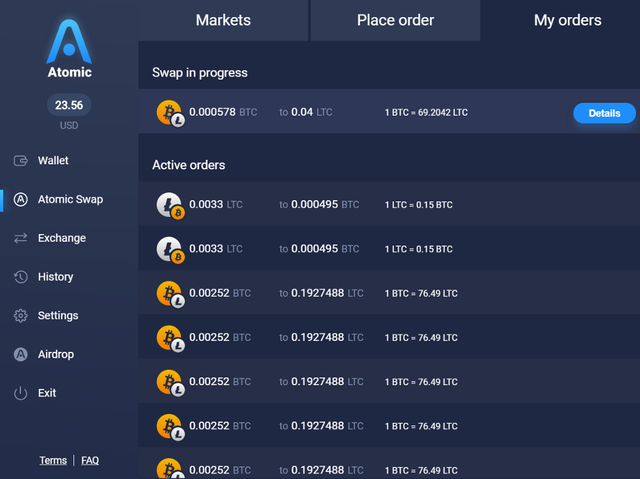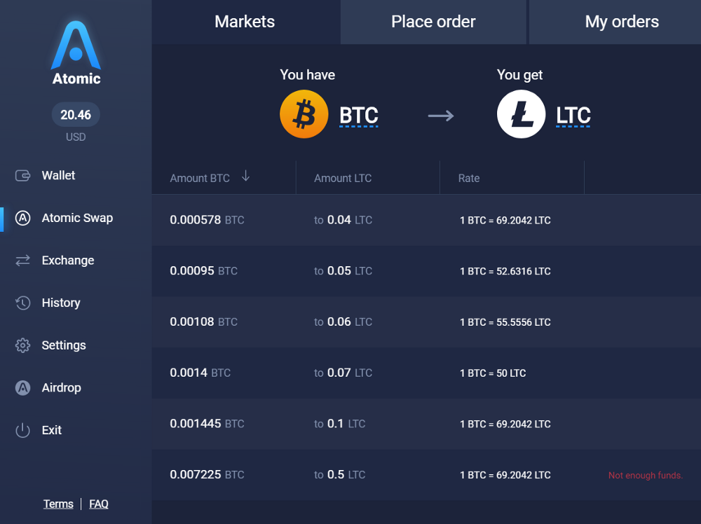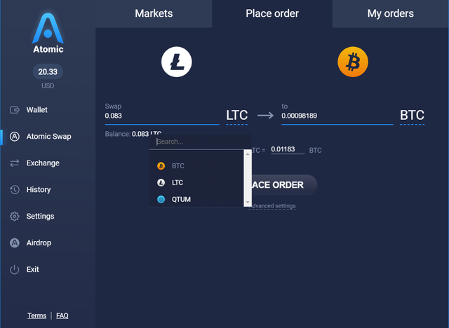 1.1. First of all, you should click the “Atomic Swap” tab at the left menu. There are three tabs from above: “Markets”, “Place order” and “My orders”. ⇩