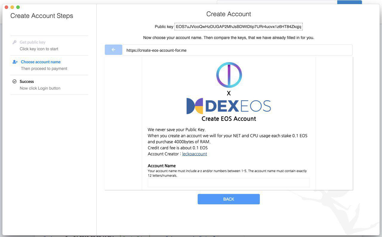 After the EOS mainnet launched successfully (and before DEXEOS was launched), we made a simple EOS account creation service for the purpose of helping the early stages of the EOS ecosystem. We found that creating an EOS account was rather difficult for normal users and even for blockchain developers.