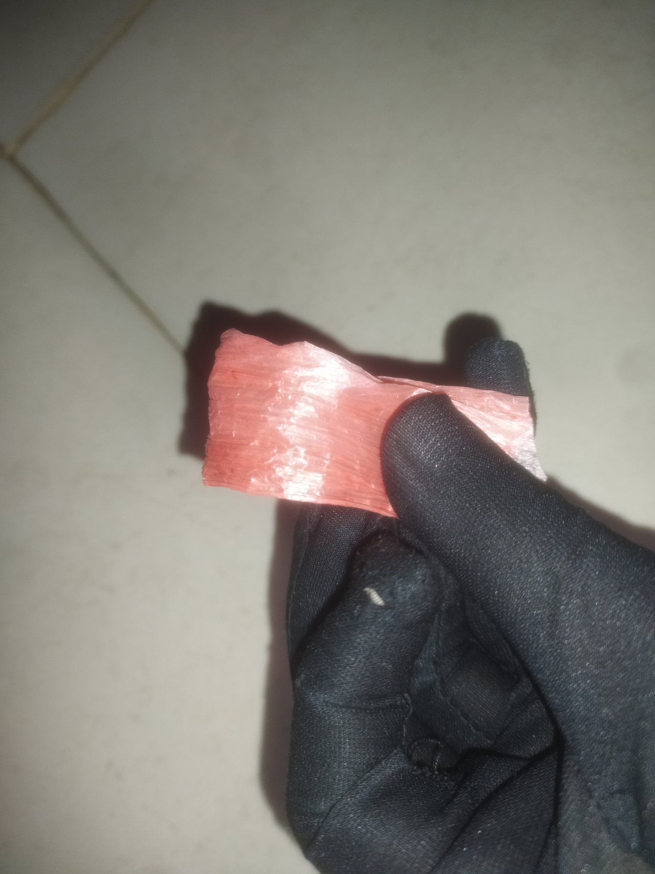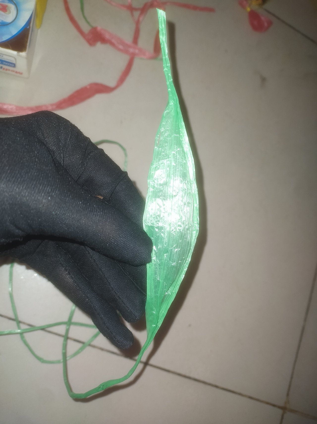 এ পর্যায়ে একটি ম্যাসলাইট নিয়ে পাতার সেইভ দেওয়ার জন্য পাতাটার মাথার অংশে আগুন দিয়ে আটকিয়ে দিলাম। এই অংশে সাবধানতা অবলম্বন করতে হবে যাতে করে হাতে আগুন লেগে বা পলিথিনের অংশ না লেগে যায়। আর গরম থাকা অবস্থায় সাথে সাথে আঙ্গুল দিয়ে পাতার মাথার অংশটা চেপে ধরতে হবে তাহলে সুন্দর একটি পাতা তৈরি হয়ে যাবে। এভাবে আমি অনেকগুলো পাতা তৈরি করে নিলাম।