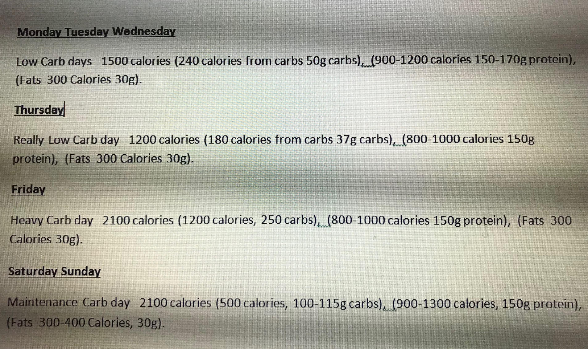 To begin you have to calculate your lean body mass by checking you current body fat %. Then subtract that number from your current weight. Once you have those numbers , you can use the formula in the book which I can not give out due to intellectual property laws. However you might be able to figure out from the example below how much Calories and Protein/Fat/Carbs to eat each day of the week. Once you have your numbers you are good to go. There is also required supplements and other supplements that are not required but do help. Now let me give you some tips that have helped me get through this diet.