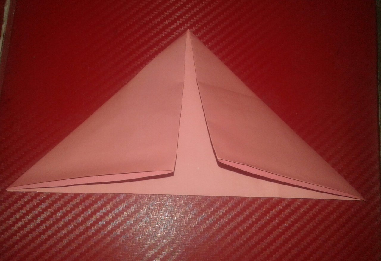 এবার ত্রিভুজের ন্যায় কাটা অংশটুকু মাঝখান থেকে ভাজ করতে হবে।তারপর ভাজ করা কাগজের প্রথমে উপরের দুইকোণা এবং তারপর নিচের দুইকোণা একইভাবে ধরে ভাজ করতে হবে।