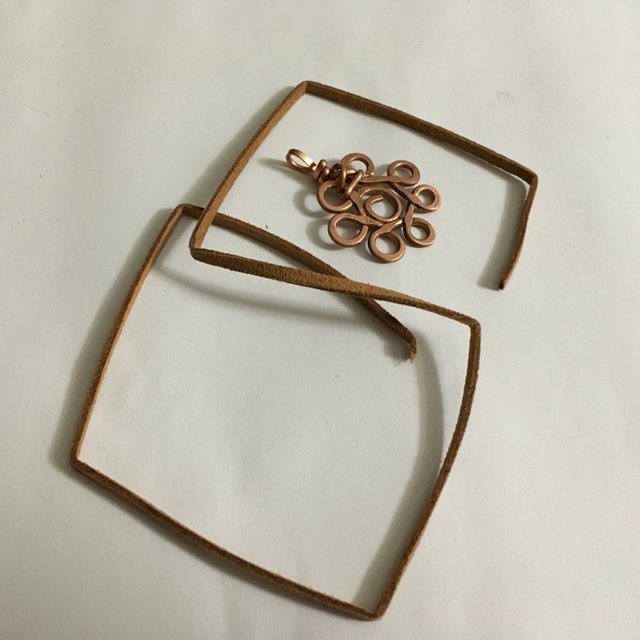 Now that your clasp is done, put your pendant on your cord. Then take one end of the cord and feed it through the hole at the bottom of your S-hook. Next, you take your thin wire and wrap it around the folded cord to secure the S-hook to the cord.