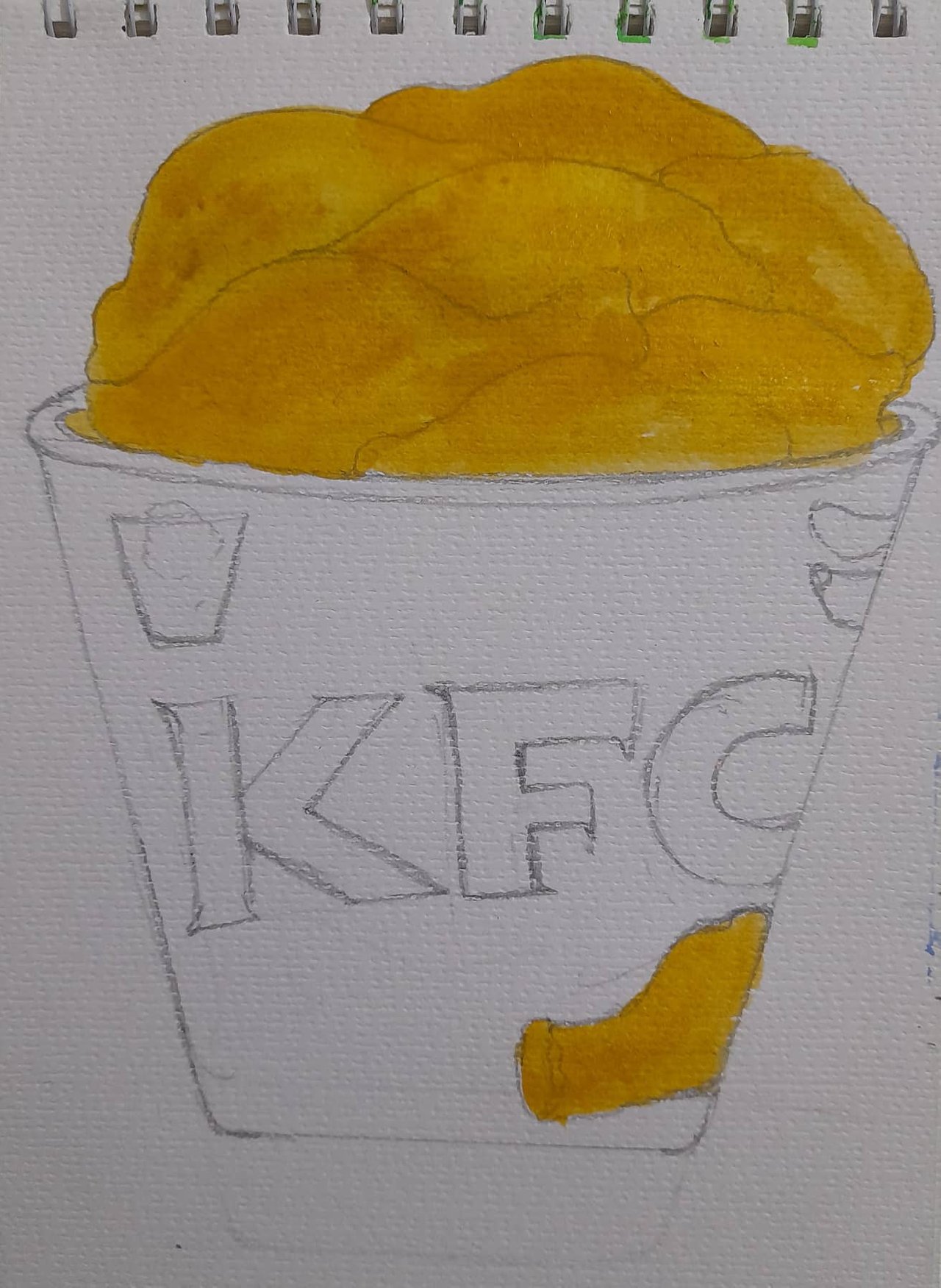 এরপর লাল কালারের জল রং এর সাহায্যে কেএফসি লিখাটা রং করে নিলাম। এরপর কালো মার্কার পেনের সাহায্যে সবকিছু ভালোভাবে গাঢ় করে নিলাম।