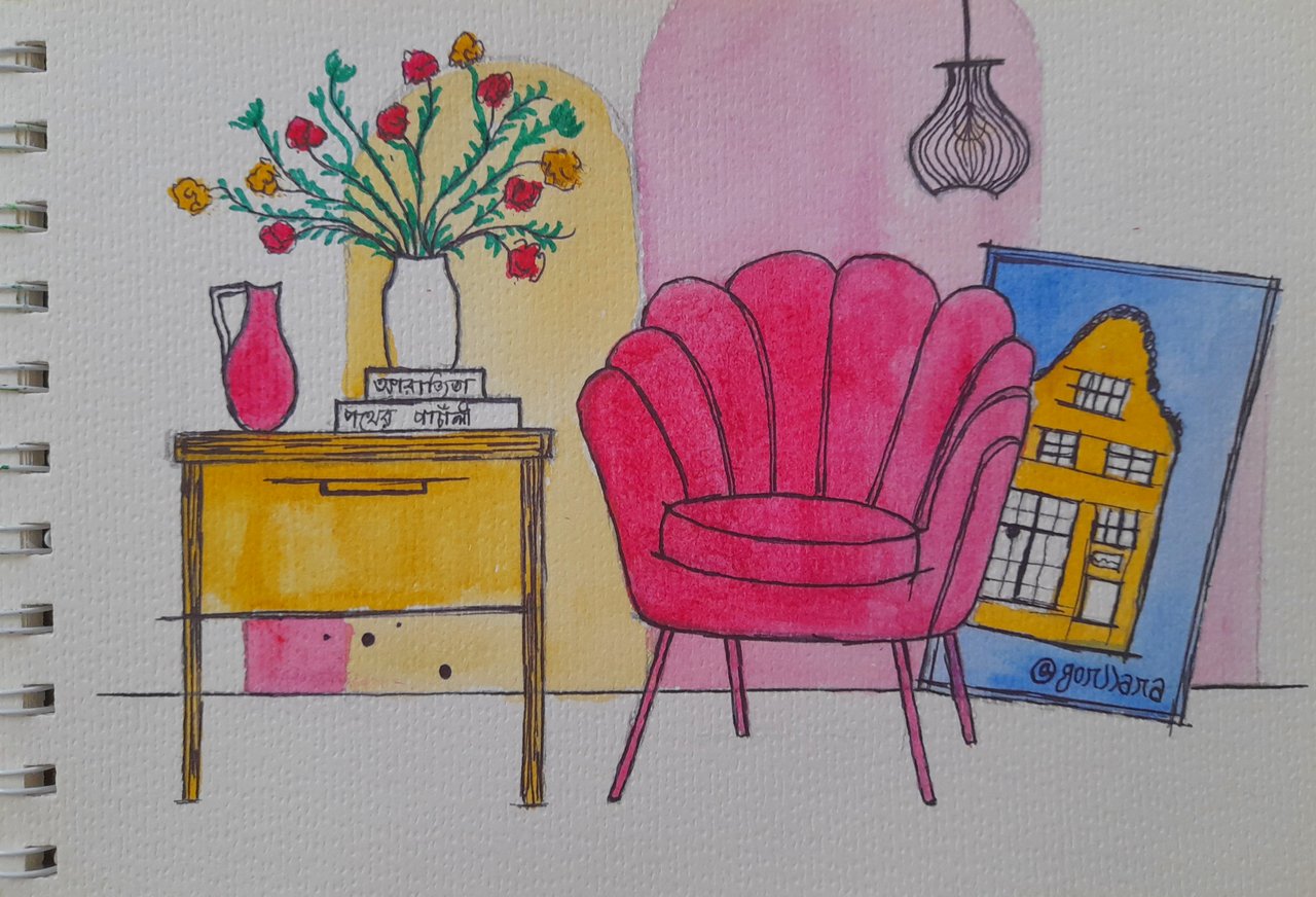 আপু ,আপনি অনেক সুন্দর আর্ট করেন।আর আজ একটি রুমের অভ্যন্তরীণ বিষয়গুলি আপনি সুন্দরভাবে ফুটিয়ে তুলেছেন।তাছাড়া পড়ার টেবিলে অপরাজিতা,পথের পাঁচালি বইসহ সুন্দর ফুলদানি সাজিয়েছেন।সোফাটিও বেশ আরামদায়ক মনে হচ্ছে,ধন্যবাদ আপনাকে।