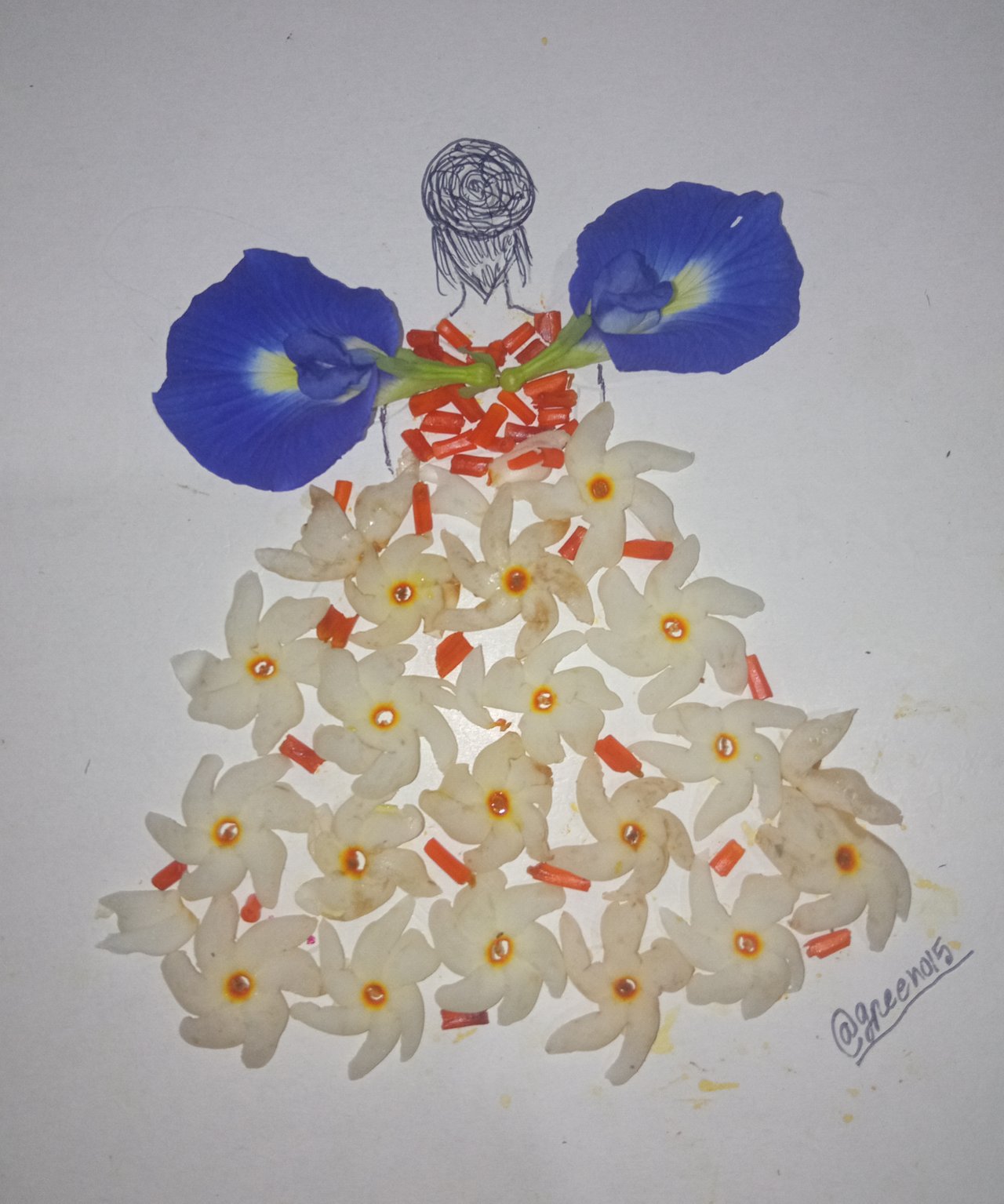 এবারে জামার উপরে অর্থাৎ পরীর পিঠের অংশে শিউলি ফুলের লাল রঙের টুকরোগুলো সাজিয়ে নিলাম।আর দুই পাশে অপরাজিতা ফুল দিয়ে ডানা তৈরি করে নিলাম।