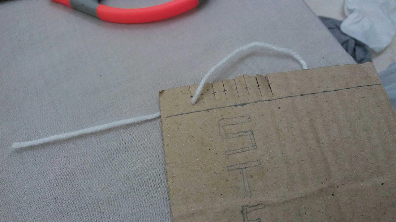 - Wedge the yarn on the first slit. Leave a two inches allowance