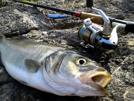 Normalde balıktayken düz kuru kayalarda bile temkinli yürürüm. Islak kayalara ise hayatta basmam. Buradaki kayaların durumu ise daha fena. Ama oltanın ucunda da levrek var... El mecbur, azim ve cesaretle ıslak yosunlu kaygan kayalardan aşağıya inmeye başladım. Tabi bir yandan kamışı dik misinayı gergin tutup balığa fazla boşluk vermemeye çalışıyorum. Bir ara çok hafif boşluk vermiş bulundum, tekrar sarıp asıldım, fazla bir ağırlık yoktu. Eyvah dedim balık kurtuldu! Neyse ki hemen sonra "Şaka len şaka buradayım hala" dercesine kendisini hissettirdi. Kıyıya yakın biraz bastı ve kalama sesini kısa süreliğine de olsa duyabildim :) İkimiz de aynı anda kıyıya ulaşmıştık. Burada dalganın etkisiyle bir kayanın alt kısımlarına sürüklendi balık. Tabii o dalga bir yandan da beni ıslatıyor :) Anlık olarak, 3 kancalı sahtenin tümümü yutmuş olduğunu görmemin de verdiği cesaretle, kamışa misinaya kuvvet deyip yavaşça biraz havaya kaldırdım balığı ve uzanıp boğazından kavradım. Artık kavuşmuştuk! Eğer ki dönüşte yukarı çıkarken de kayıp düşmezsem, balığı düşürmezsem, sıkıntı olmazsa işlem tamamdı! Ki yine sıkıntısız şekilde yukarı çıktım.