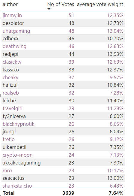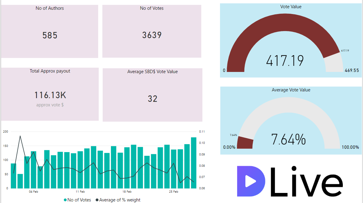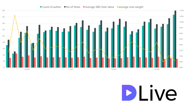 In Feb 2018 DLive voted 3639 times for 585 Authors. The average vote payout was SBD $32 and the total approx. payout given by DLive was SBD $116.13K. We can also see from above that the average % voting weight used by @dlive was 7.64% and the average number of votes given per day was 130.
