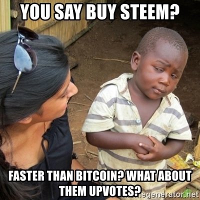 Faster than Bitcoin? What about them upvoteschronocrypto (73)in #dmania • 8 years ago View post on dMania #meme #bitcoin #steem #upvotes