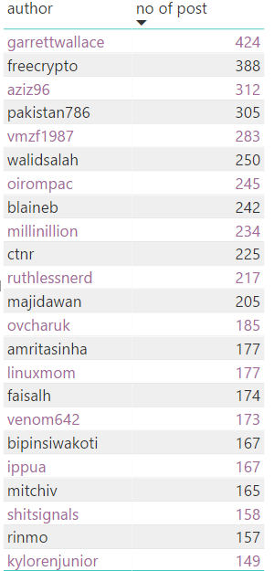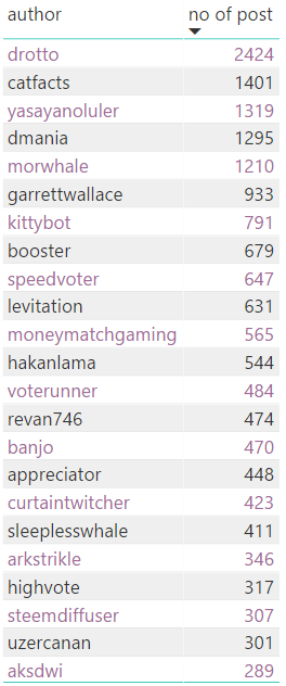 Using PowerBI, I have connected to the SteemSQL database (paid subscription service held and managed by @arcange).