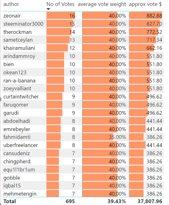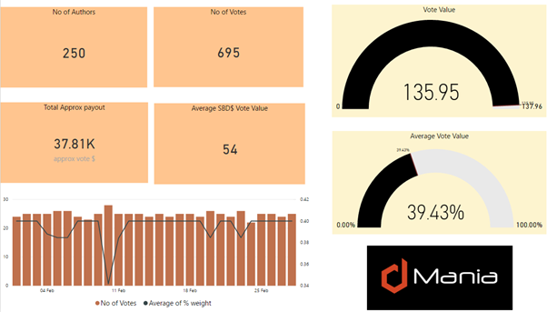In Feb 2018 DMania voted 695 times for 250 Authors. The average vote pay out was SBD $54 and the total approx. pay out given by DMania was SBD $37.81K We can also see from above that the average % voting weight used by @DMania was 39.43% and the average number of votes given per day was 24.8.