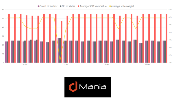 DMania is an awesome project, receiving 62K posts in the month of Feb and voting for 695 of them. This means that almost 1 in 90 posts made will be voted on by @DMania. @DMania voted on average 24.8 times a day in Feb. I am not sure how much of this is manual curation and how they pick the posts they vote on – maybe someone from the DMania team could let me know?