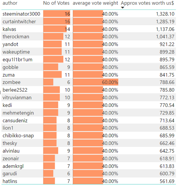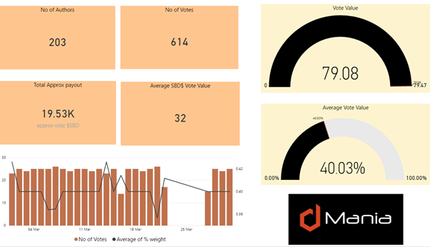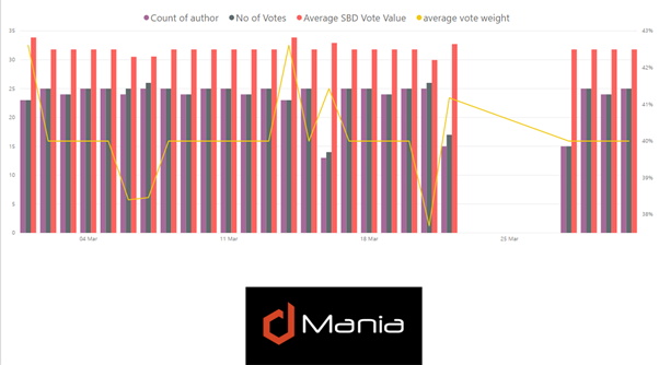 If horizontal analysis is applied between the February and March @DMania votes analysis. Although March is 3 days more than February, there was a drop of 11.65% from 695 down to 614. Furthermore, the number of authors that @DMania also voted declined by 18.8%. Despite a decrease in the number of authors voted the number of votes casted also decreases. The average voting weight used by @dmania are similarly close but when it comes to average votes given per day, there seems a large discrepancy. What could be the reason why they both decrease? Is there a direct relationship between the number of authors and the votes casted by @DMania? Any factors why this happened?