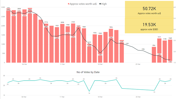 This is charted below with the US$ value of the votes given per day in the column with the line showing the daily high SBD price as per coinmarketcap.