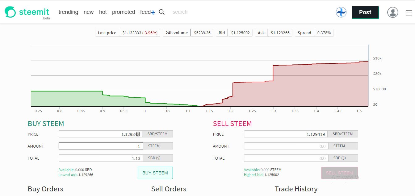 This will take you to the internal Steem market. If you click Buy or Sell, you'll be taken offsite to the Blocktrades exchange. You can sell buy Steem here as well, but you'll need Ethereum or BTC to do so.