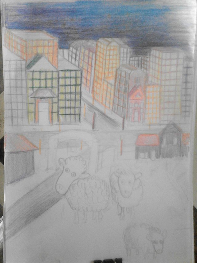 The progress took about 8 hours and I really enjoyed it, it reminded me of my drawing when I was a kid. In this picture I made a drawing of a sheep in a meadow on the city border. The sheep being herded by their owners to return to the cage because it was night. The medium that I used is colored pensil on paper.