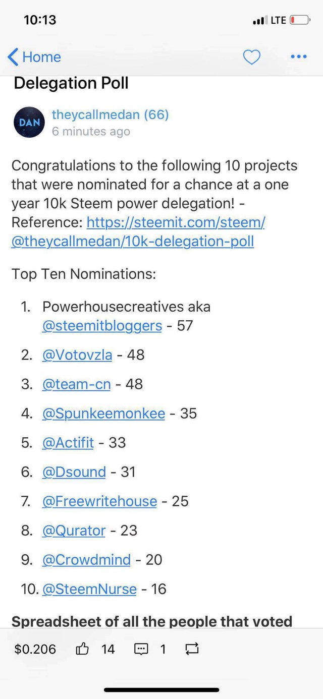 @theycallmedan 於一週前發起一事,可為一個帳號給予10000SP的代理,過程中要兩輪投票,第一輪投票,新手村在並列第二名。可進入第二輪投票。
