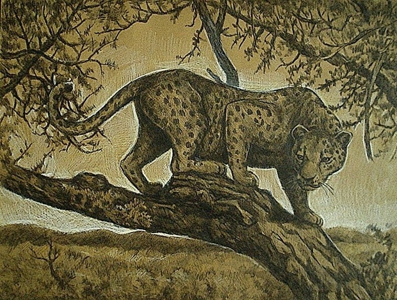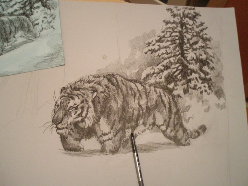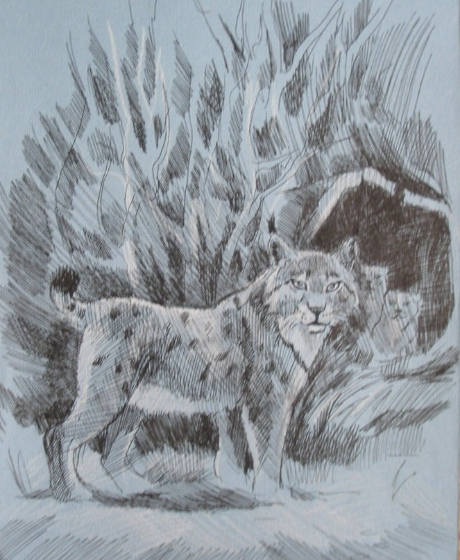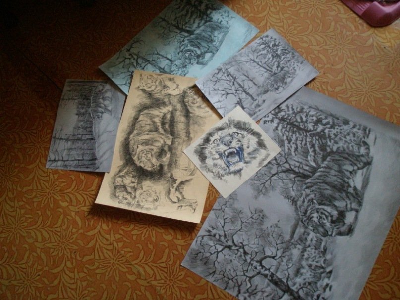 In general, even in the first year I knew for sure that I would take subjects with animals for the thesis, because I'm an animal artist first of all. Since I live in the Far East - in the taiga region, and I'm a patriot and very fond of our magical nature, in which the south meets the north, my choice was not difficult. I decided to paint animals endemic, inhabitants of our northern jungle. Therefore, I performed a series of graphic sheets with cats of the Far East taiga. And this is a tiger (an amba - so they call the tigers in the Far East, the "amba" from Nanai means big), the Far Eastern leopard and the lynx.
