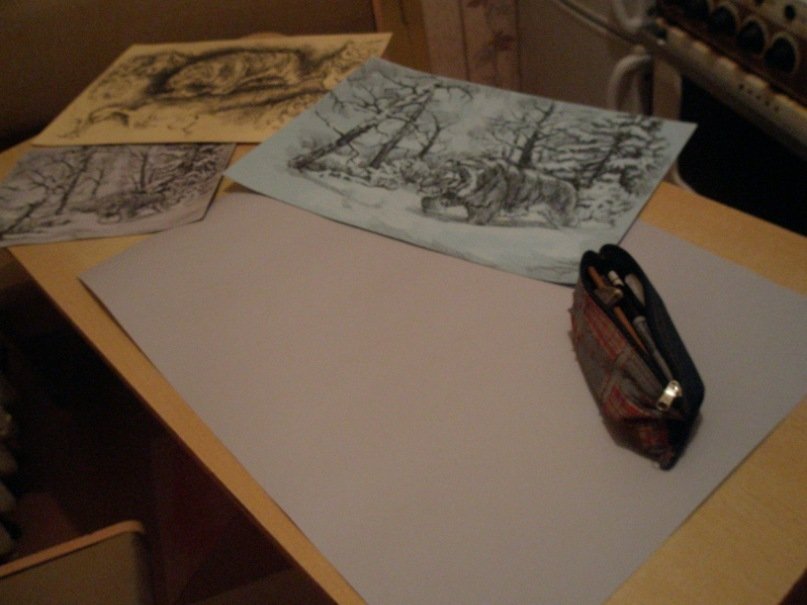 My work place. I have a desktop easel - a very handy thing for the graphic artist - since he allows you to place boxes with pencils, pastels and other things beside him. He stands on a special table reserved for him. While I'm working on the drawing, I do not remove the sheet from the tablet and pencils - everything is in untouched form, so that I can come up any minute and start drawing without wasting my time preparing and getting endless boxes and cases. Preparation sometimes kills the desire to draw, so I keep it to a minimum. The graphic tablet is on the working computer desk. It only needs to connect and open the program. I must say that I always collect materials before I start drawing something. Therefore, I am often overwhelmed with photographs and other things - with visual images and maps....