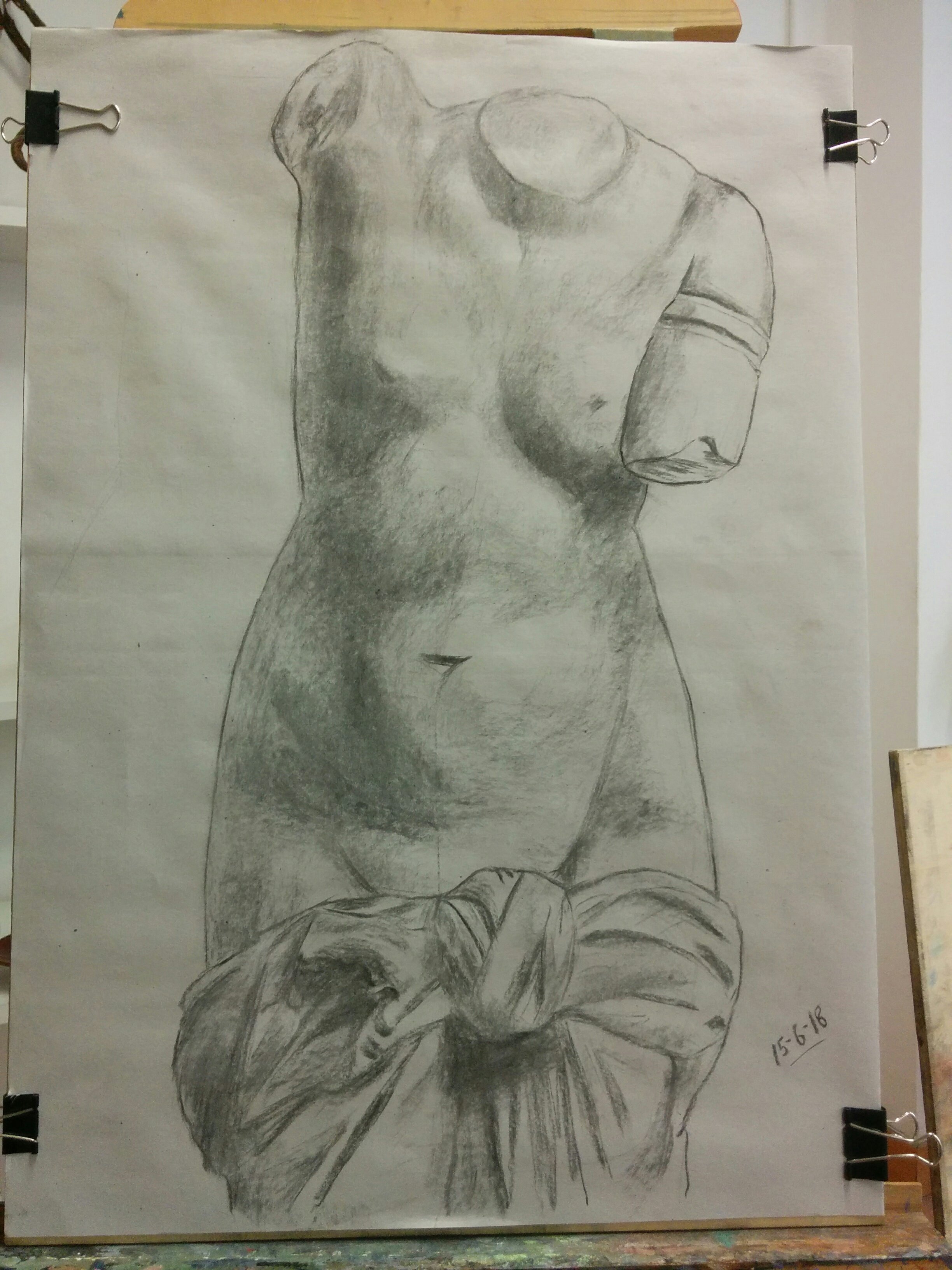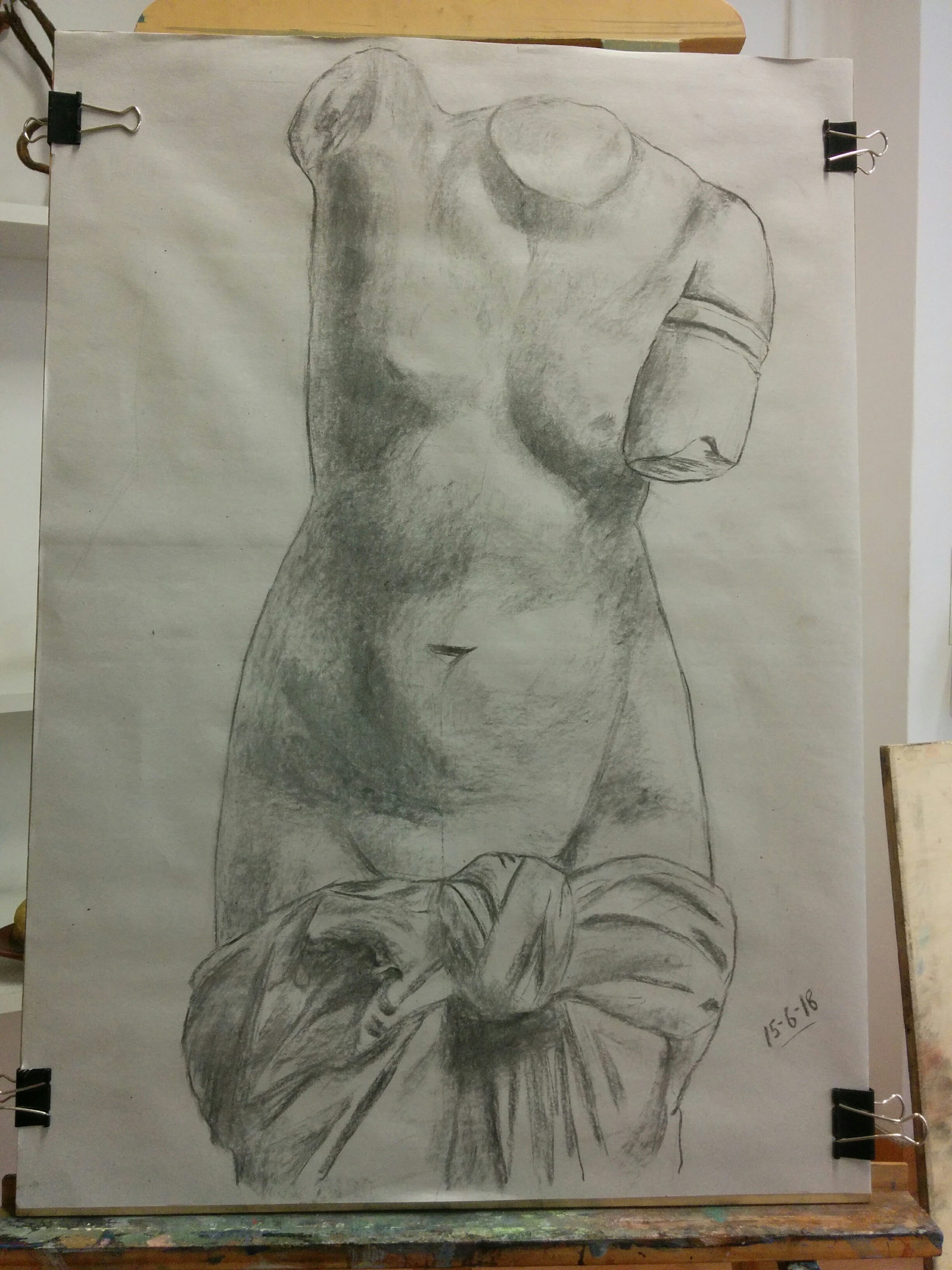 I redrew the knot of the fabric again, which I had made too small. And I started to mark the borders between light and shadow. It was one of the difficulties of this drawing. Contrary to what happened with the previous drawing *, in which the lines were very defined, in this the forms were very soft and I could not draw them with defined lines. That's when I decided to venture to try shading. After my teacher gave me some basic instructions I started the process. Unfortunately the proportions were still wrong. The thorax was too short, but I decided to leave it like that, because to fix it was to go back and I preferred to experiment with the volumes.