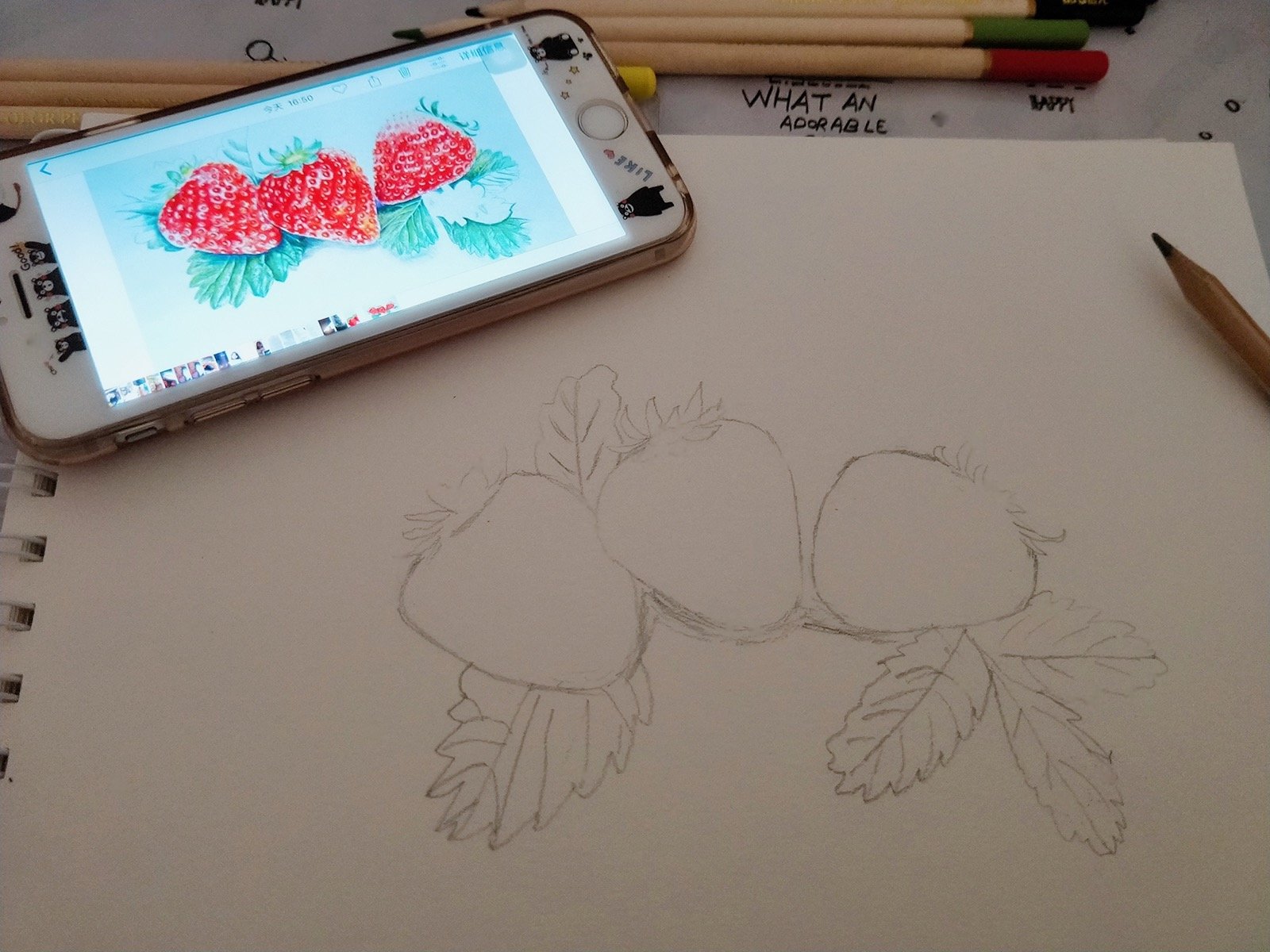 用铅笔画出大概的轮廓,从草莓开始,再到叶子。
