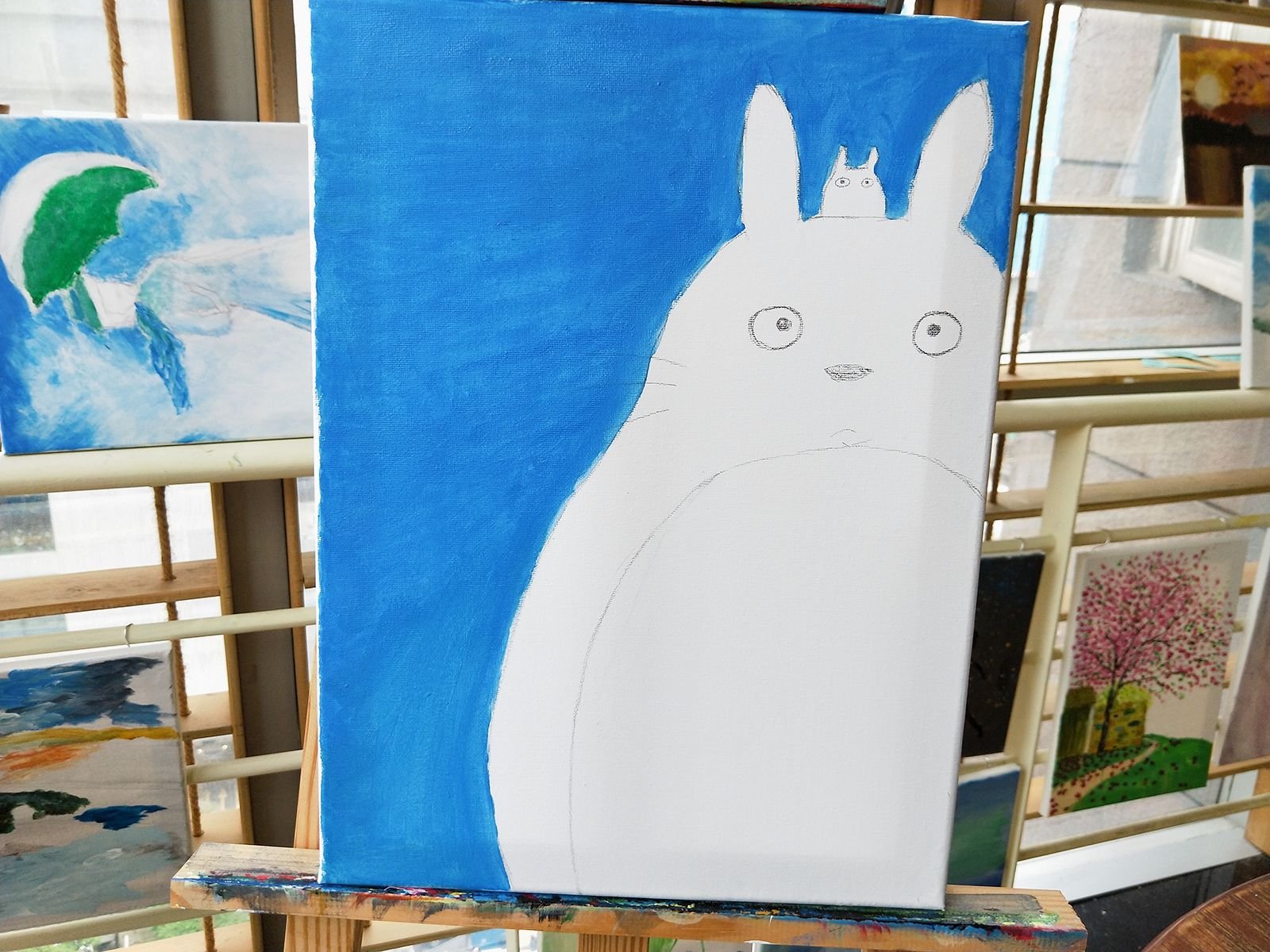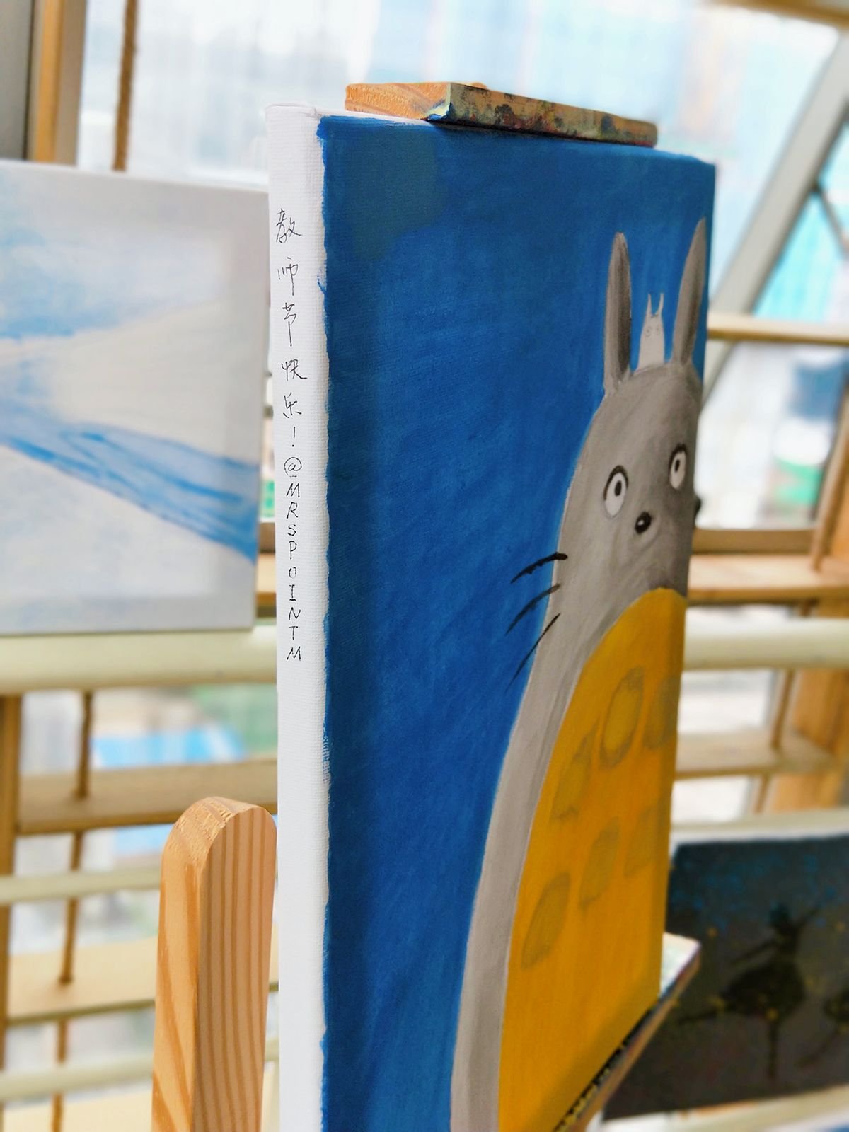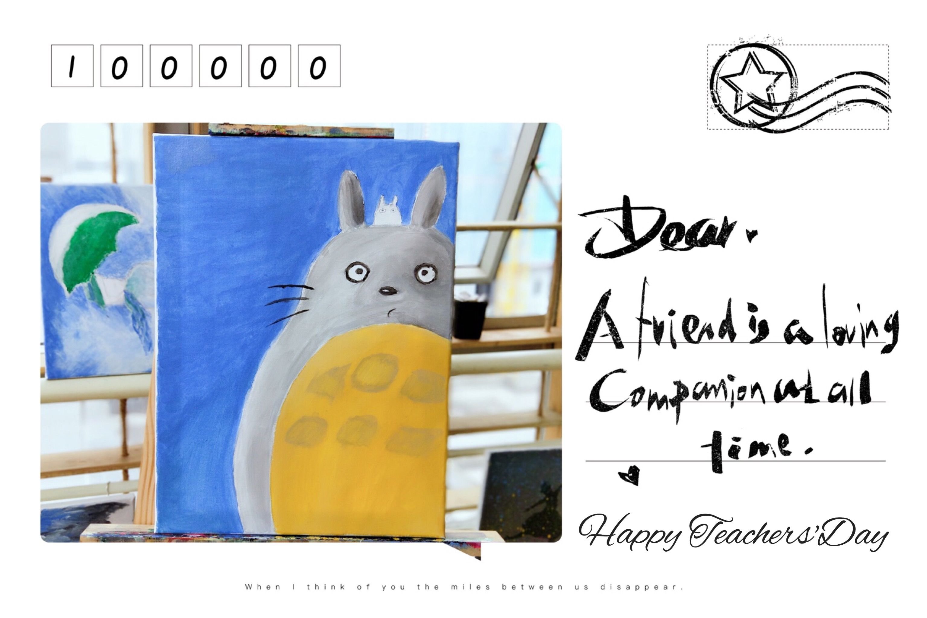 It's the 3rd time that I've taken part in Drawing Challenge Contest held by @helene. Yesterday, I happened to find a studio called Hua She and experienced an oil painting course. And I want to take this opportunity to take this painting as the illustration of postcards and give them to my dear colleagues and myself. All of us are teaching senior 3 students now and this card can be considered as my gratitude. Although I haven't won any prize before, yet I'm always enjoying the process. This time, the theme is to draw a card for teachers . I choose to draw totoro, which I think is cute. Now I'd like to share my painting with you(^ __ ^).