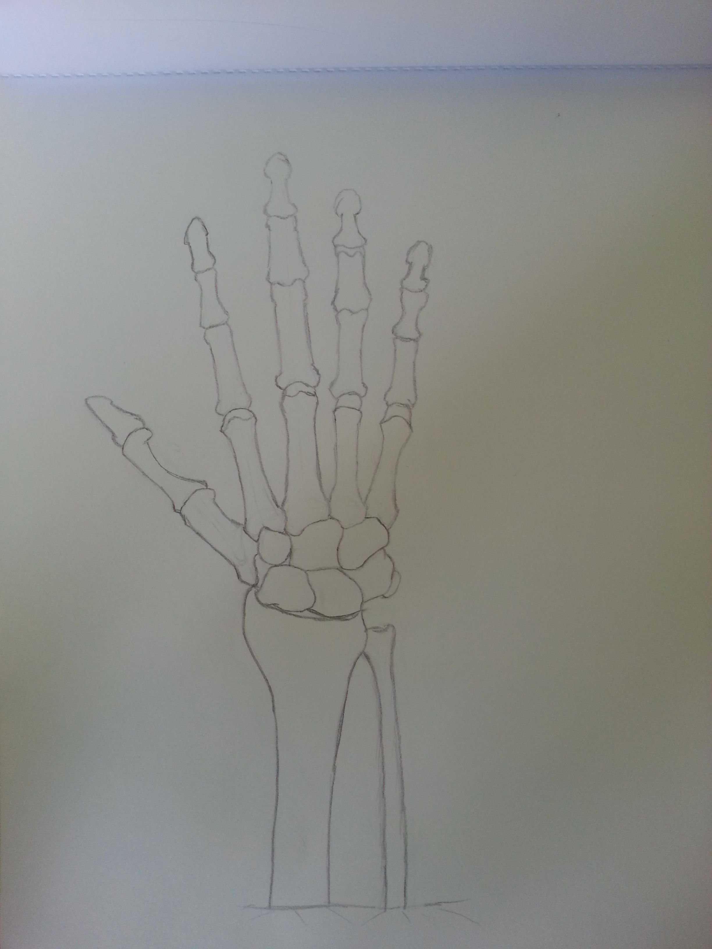 In this picture, i drew the base of the palm in a simple rectangular shape. This will be the guide for the bones of the hand.