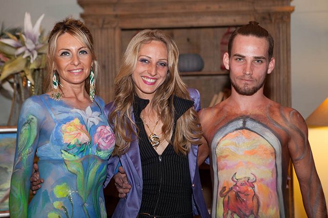 I drew it with the chalks on cardboard, and it was a sketch for a bodypainting that I made in Spain for an exhibition of mine, and that you can see in the picture below.