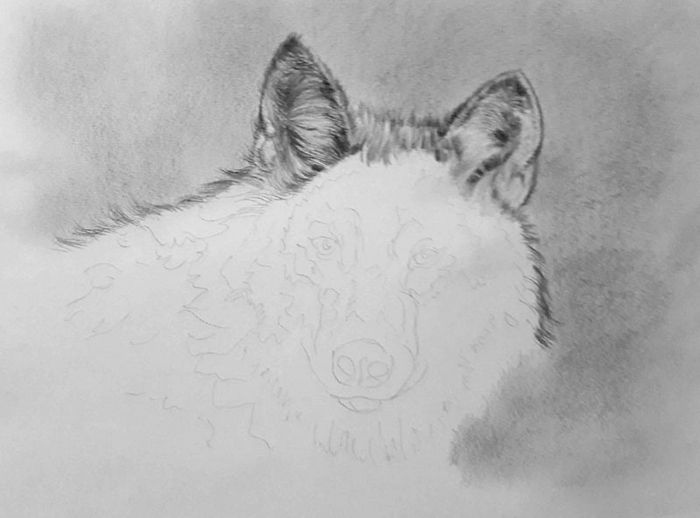 I started with outline and background as the fur will be drawn on top of the background. I hold the pencil flat with long handle and press it softly so that it gives the natural texture using the surface of paper. Then I rub it slowly using my finger so that the texture blends properly. Make sure the finger is not wet or oily.