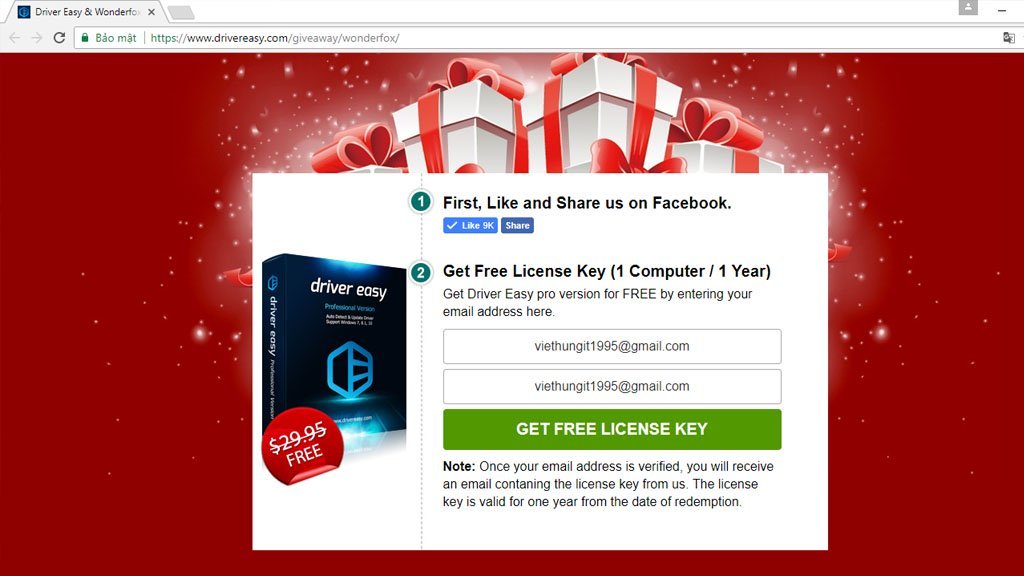 Step 1: Very easy, just go to Driver Easy & Wonderfox. Giveaway Cooperation> Fill in your personal email address and click "GET FREE LICENSE KEY" as shown below.