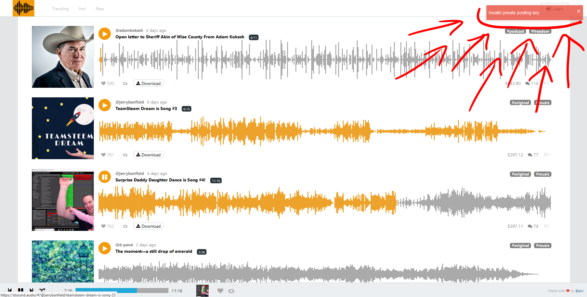 On every Website, that I know, that is powered by SteemIt, I can login with my usual SteemIt Login Data, but not on dsound.audio. If I try to use the same Login Data there, it just shows me an error Message like this: