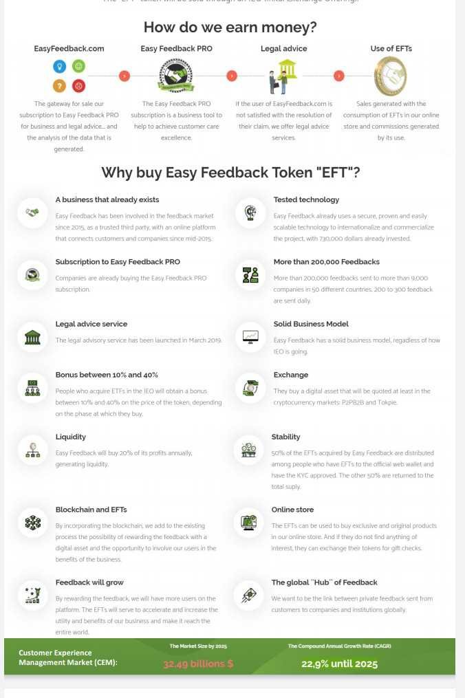 Easy Feedback Token, with the ticker “EFT” was created to reward people who from www.easyfeedback.com communicate useful and private feedback to improve products, services and processes of companies and institutions. EFT can be exchanged for products, services, cryptocurrencies or money at a market price. Easy Feedback has been involved in the feedback market since 2015, utilizing market concepts and innovative technologies that help solve issues related to feedback. The project took the disruptive route in 2018 as it were able to incorporate blockchain technology into the feedback market and thus launching a token to make it possible.