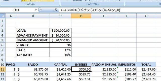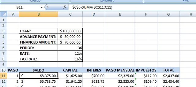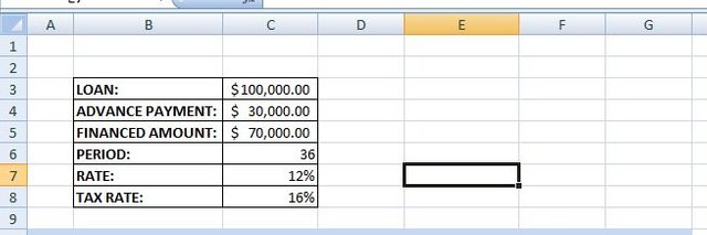 For the creation of our amortization table we will use an example with a $ 100,000 value loan with a prepayment of $ 30,000 at a rate of 12% over a 12 month period, plus we will also add a 16% interest tax.