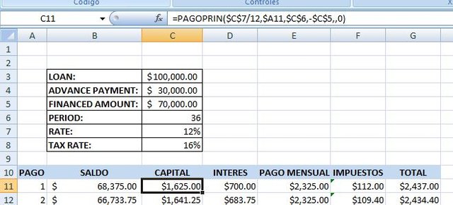 In this way we will be able to calculate the amount of our monthly payment that will be destined to the payment of capital of our debt. Similarly, the second argument of the function indicates the period number for which we are doing the calculation. Note the result by including this formula in our table using the previously defined variables: