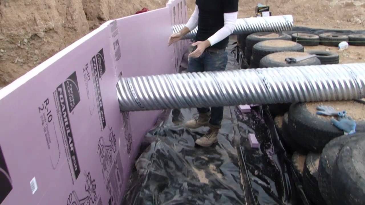 The tires become the structure and mass, but we're adding another 3 ft(~92 cm) to that mass by isolating it away from the cooler earth. Because, see, it's the cool earth that cools off this air. This air goes through the earth and cools off, well in the winter time when we plug these and the frigid air goes down into the earth 3 or 4 ft (92 or 121 cm) but it can't get through this insulation. So now, there's close to 6-7 ft (182-213 cm) of mass that belongs to this space. And... the way that works in a... It's an actual... I do observe laws of physics, I don't really observe other laws *laughter* But... Laws of physics, I call unarguable and... You know, you can't argue with the sun. It's gonna do what it's gonna do. But anyway, a law of physics is that heat moves to the cooler place. Not vice versa.