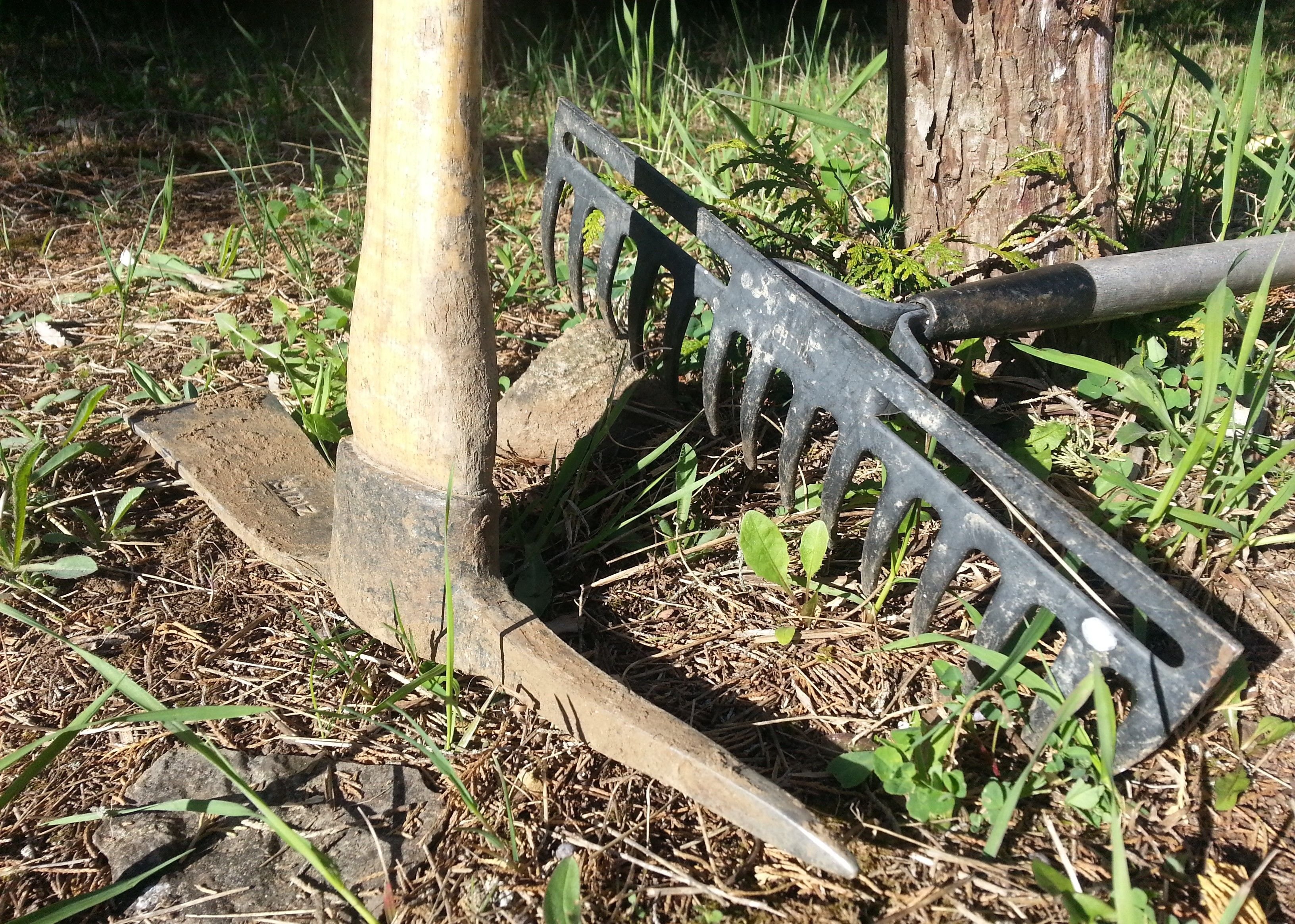 A Pickaxe and Garden Rake would make a great combination for path construction and leveling. For this rough cut path I'm going to focus on the use pickaxe. When turned sideways it is useful for moving the dirt around - just like the back of a garden rake. The pickaxe is a necessity for doing any digging into this clay and rock filled ground. A pickaxe also makes quick work of path-intruding tree roots.